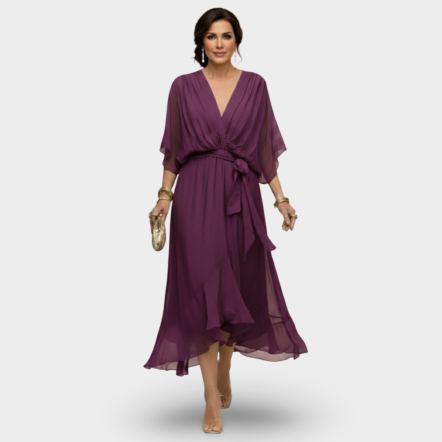 Sukienka IrenaV-Neck ponadczasowej Gracji ucieleśnia bezwysiłkową sofistykację i kobiecy urok. Wykonana z lekkiego, zwiewnego szyfonu, ta sukienka elegancko otula Twoją sylwetkę, tworząc miękki i elegancki ruch z każdym krokiem. Pięknie uformowany dekolt w kształcie litery V podkreśla Twoją naturalną formę, podczas gdy przewiewny materiał zapewnia komfort i pewność siebie — idealna na specjalne okazje, słoneczne dni lub eleganckie wieczory.